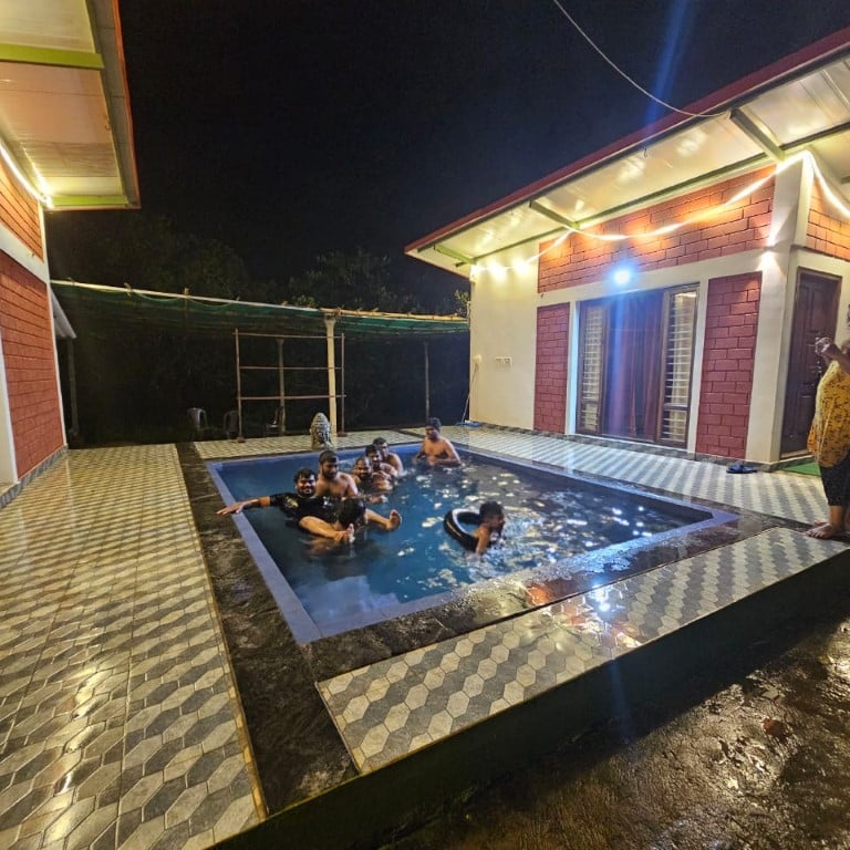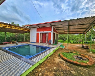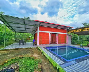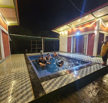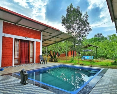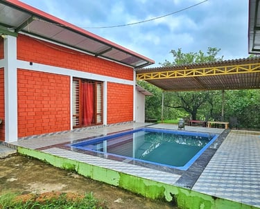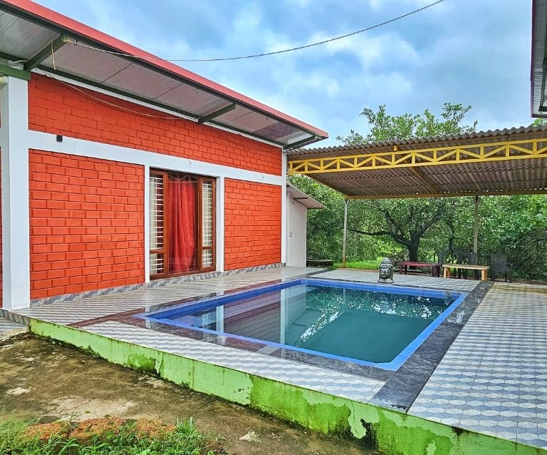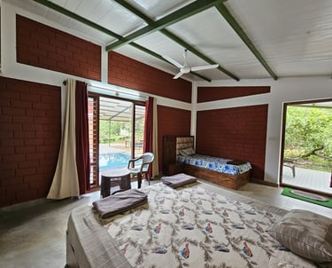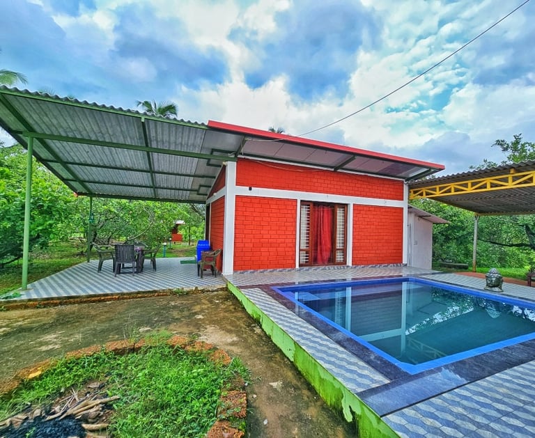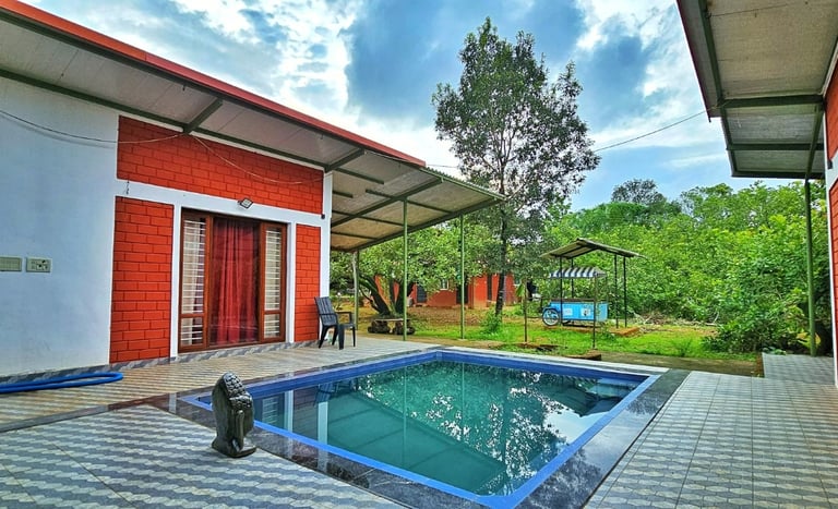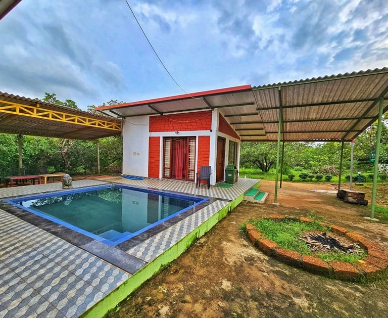 Discover Poolside Paradise, the crown jewel of our farm accommodations. This exquisite retreat includes two charming cottages constructed from firm compressed red soil, providing a consistently dry and comfortable atmosphere. These cottages are uniquely connected by a private pool, perfect for cooling off or enjoying a serene swim under the open sky. Adjacent to the pool, a cozy campfire area awaits, offering the ideal setting for relaxation and evening gatherings. Experience the ultimate blend of rustic charm and modern luxury at Poolside Paradise.