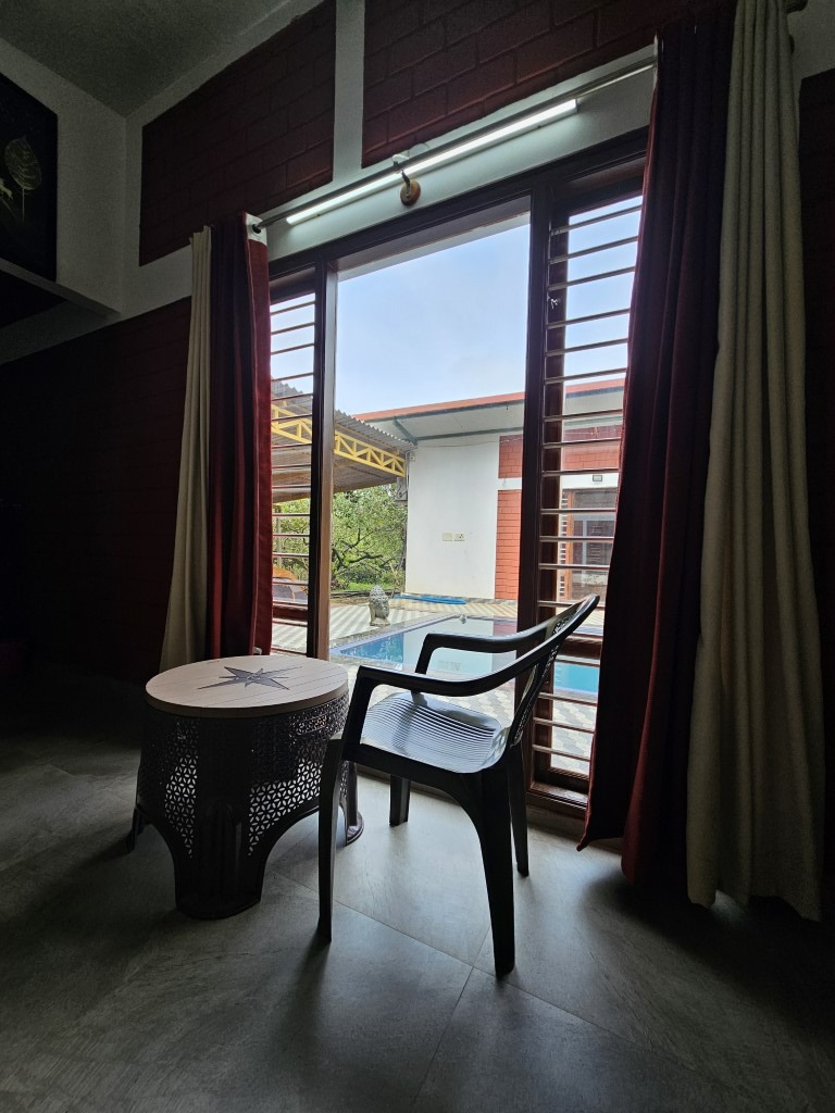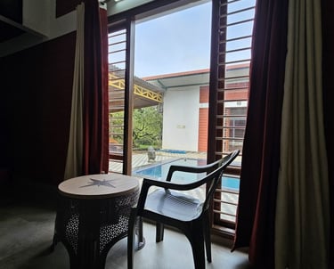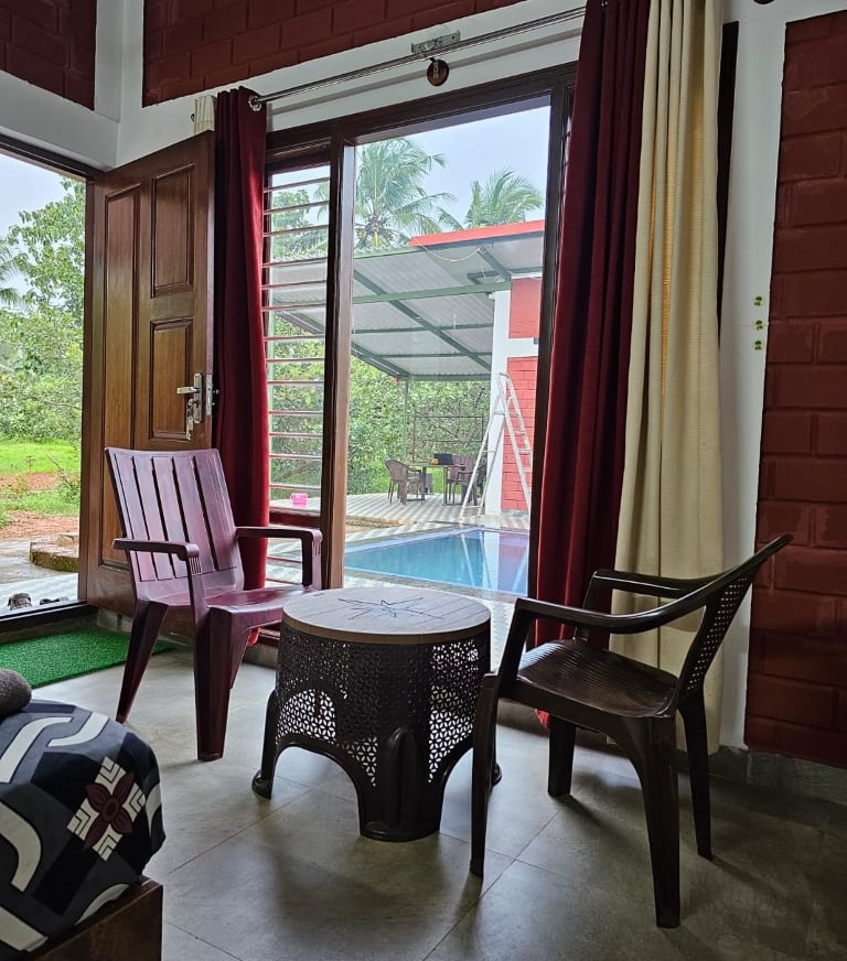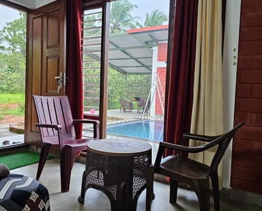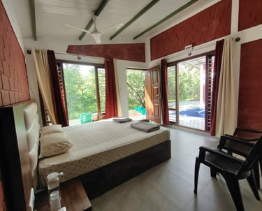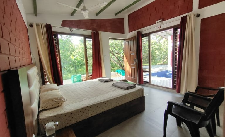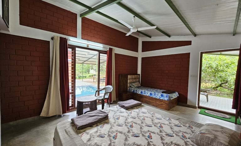 Cottage 1: Equipped with a king-size bed that offers a stunning view of the swimming pool, and an attached bathroom.